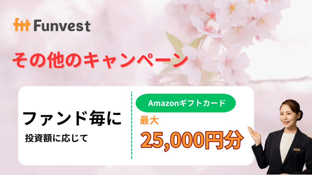 • Amazonギフトカードは、対象ファンドの成立後に、Funvestの会員情報として登録されたメールアドレス宛に送付するものとします。(※「gc-orders@gc.email.amazon.co.jp」のアドレスから届きますので、メールのドメイン指定受信をされている方は、「@gc.email.amazon.co.jp」ドメインからのメールが受信できるように設定をお願いいたします。)