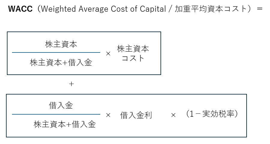 簡単に考えると、株主資本コスト(株主の期待利回り)と他人資本コスト(借入金利)を加重平均しているのね